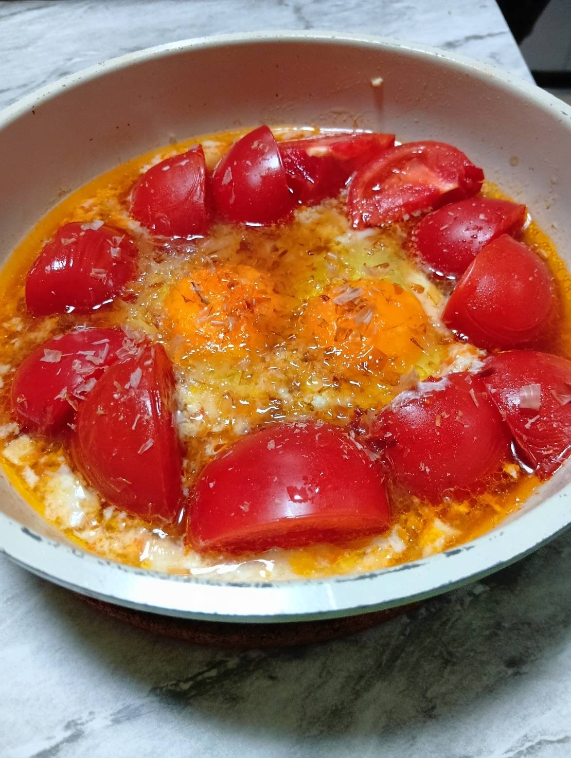 加熱したトマトに卵を重ね、酸味をやわらかくまとめる